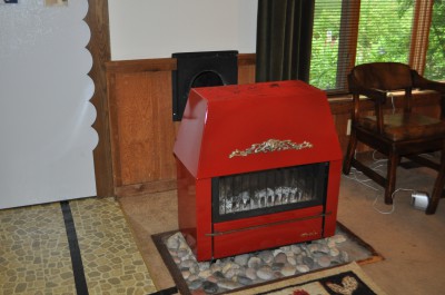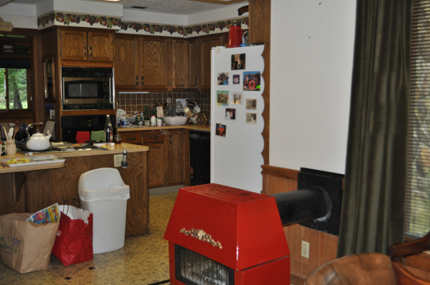 - BEFORE–The wood-burning stove dominates the room.