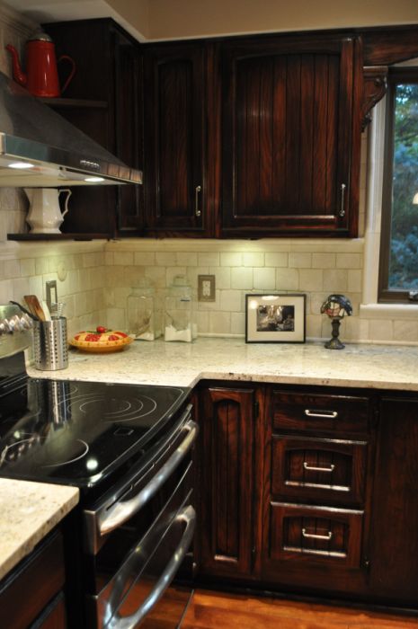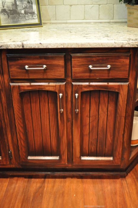 (2) The cabinets required a 4-step process to get this look. 1. Liquid De-glosser was used to prepare the finish for staining. 2. A coat of Rust-o-leum Kona stain was applied to darken the cabinets. 3. A coat of Rust-o-leum Black Cherry was applied to give a rich red tone. 4. A few coats of polyurethane went on to toughen up the finish. These stains are available at Lowes.
