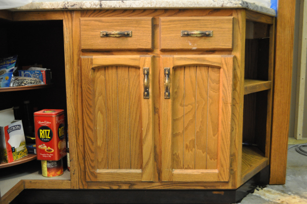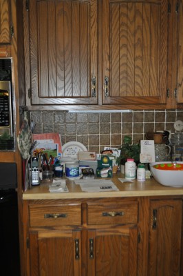 - BEFORE–The cabinet color was dated, sort of a light walnut. The pulls were a medieval antique brass. They had to go.