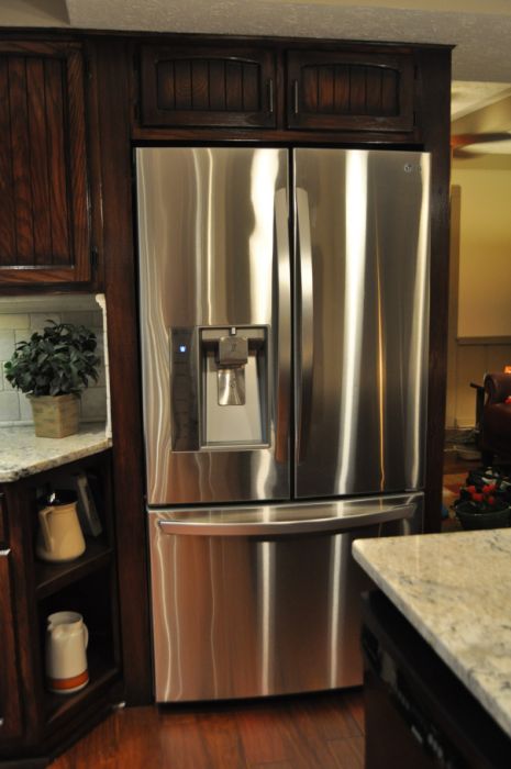 - We moved the refrigerator over and lined it up with the newly installed upper cabinets, re-purposed and cut the cabinets above the fridge to fit and trimmed the whole thing in oak, creating a integrated look that makes the kitchen seem even bigger. Another corner display shelf was created below.