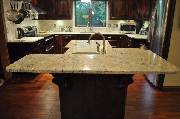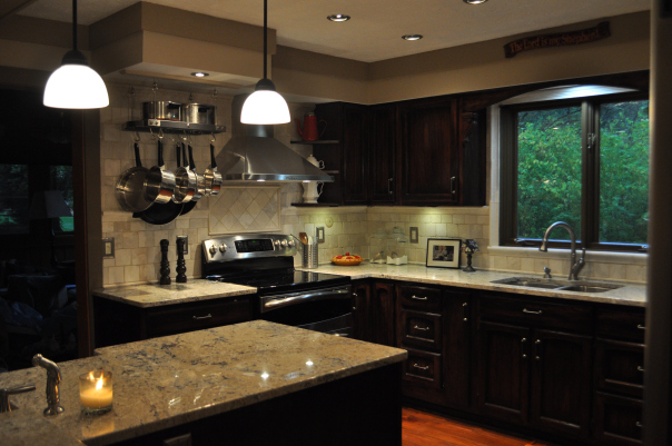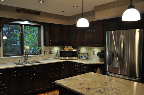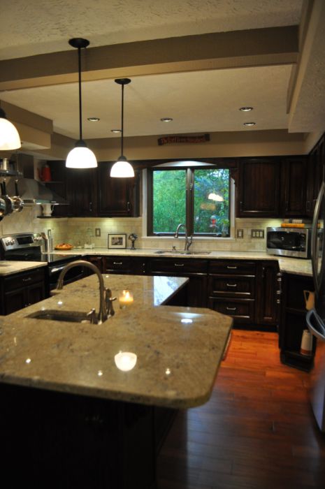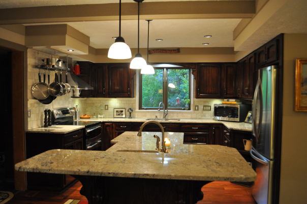 - AFTER–The island and counters have been raised, new granite counter tops (Bianco Romano) are on, pendant lights (1) replace the old florescents, the cabinets have been refinished darker (2) to contrast the new natural tile (3). The old scalloped trim above the sink has been replaced with an arch supported by corbels (4), and the frame around the windows is now detailed stone border for a classic look. The walls and ceiling have been warmed up.(5)