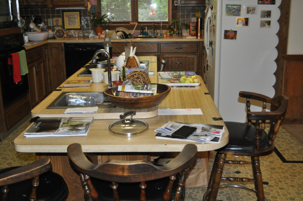 - BEFORE–Another view of the kitchen from the island. The cabinet color is pure ’70’s. The old bar stools are perfect.