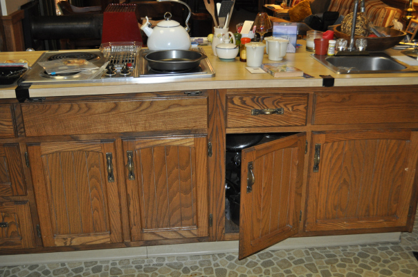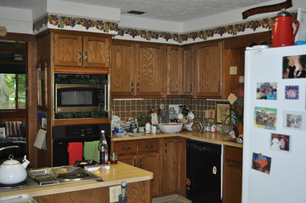 - BEFORE– On the south side of the kitchen, the stove cabinet eats up floor to ceiling space, the dishwasher blocks multiple cabinet doors when open, but…the grape border does add a certain granny charm.
