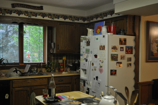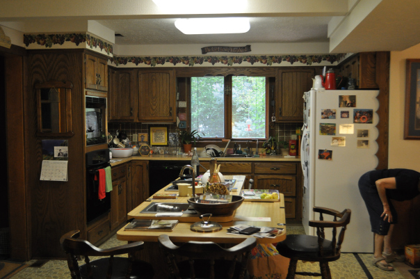 Mom’s house was built in 1979, long enough ago that many design elements are outdated. Add to that the fact that it is on a concrete slab and the home was configured oddly to be wheelchair accessible, and you have some interesting problems. Plumbing can’t be changed, the concrete promoted years of condensation and rot in the cabinets, and there are limited options when reconfiguring the kitchen layout. But enough of the boring explanation. Here are the pictures, with slightly more interesting explanations. For those interested in some of the specifics of products and processes, I’ve created footnotes at the end of this post.