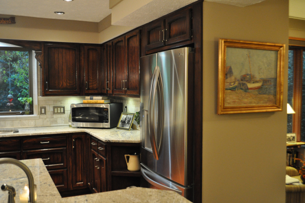 - AFTER–The refrigerator is moved over and upper and lower cabinets moved in from the other side of the kitchen. Plus, refinished cabinets, new tile, lighting, increased floorspace, and more workspace on the island. All the old, ornate door pulls have been replaced with simple, clean pewter-look pulls (8).