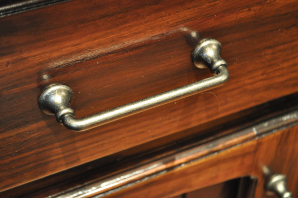 - The new pulls are simple and complement the antiqued cabinet finish, creating a clean look.