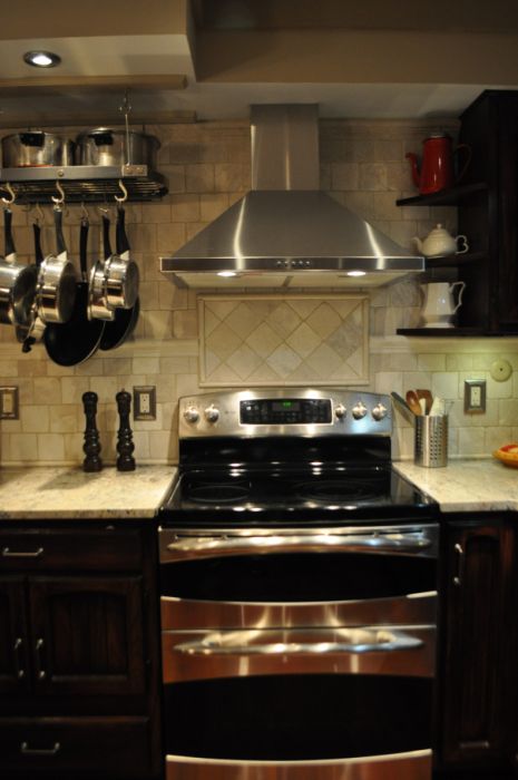 - AFTER–The upper and lower cabinets were moved to the other side of the kitchen and a new GE double oven moved in. A chimney range hood (6) was added and a pot rack (7) now hangs where the wall oven once was. New workspace is opened up on the counter below the pot rack and on the island where the cook top once resided.