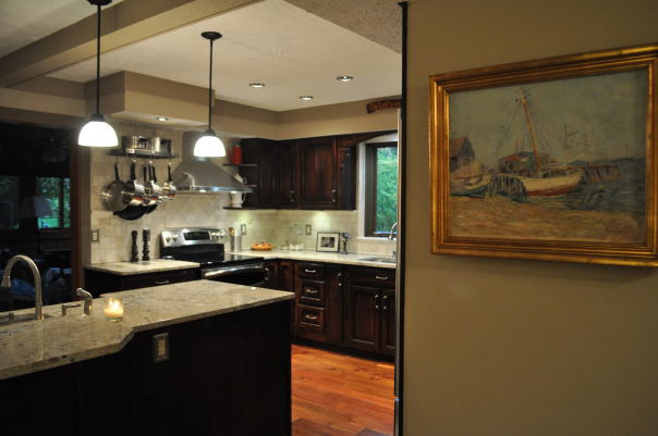- AFTER–A four-step process of refinishing gave the cabinets a richer, antiqued look, contrasting beautifully with the granite counters, and complementing the new Acacia wood floor(9).