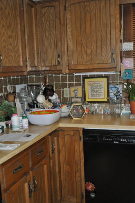 - BEFORE– The southwest corner is cluttered and cramped, with an unattractive dishwasher front and center and blocking cabinet access when it opens.