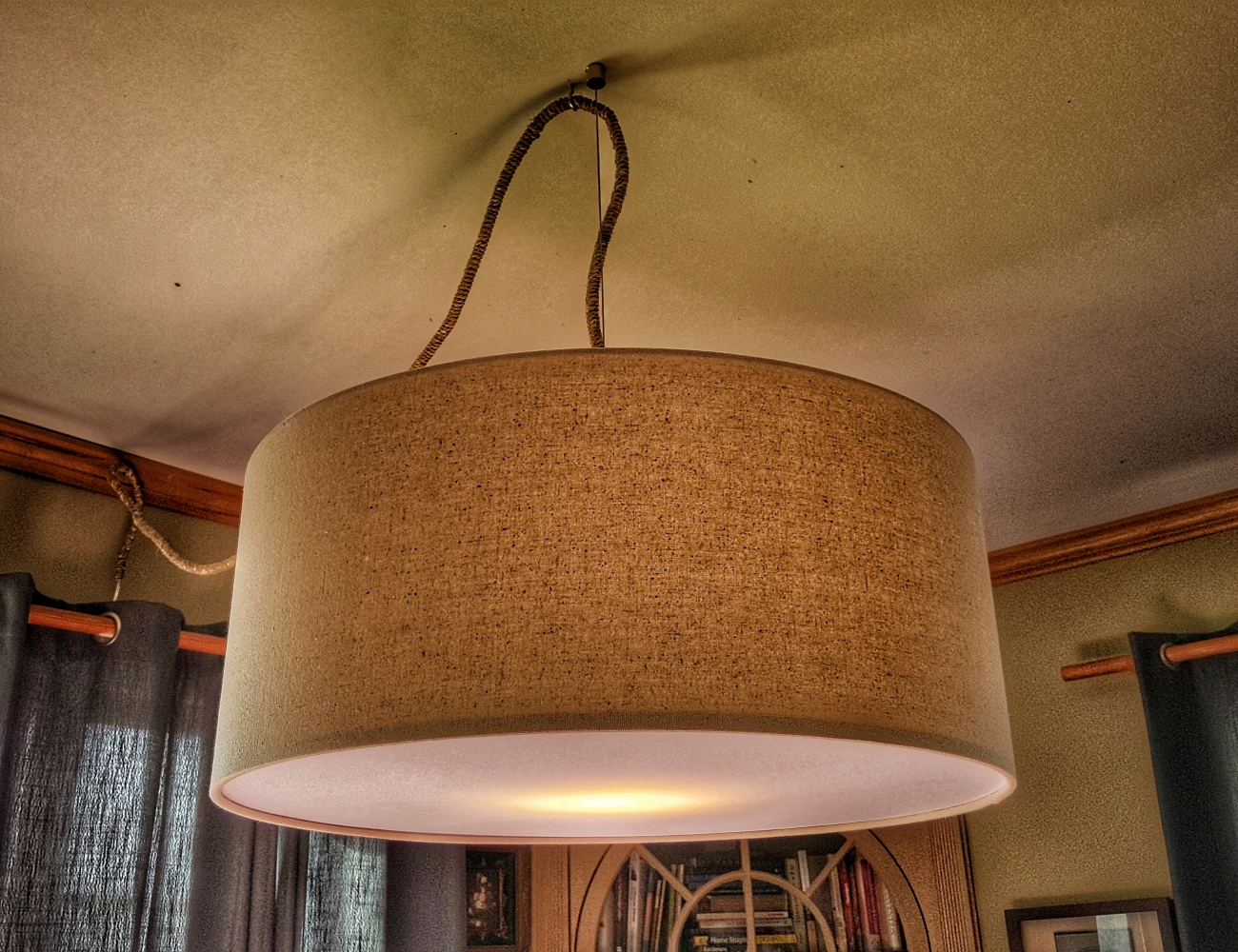 The lovely drum light comes from West Elm, and was an excellent value. It's a lot bigger than it looks here, actually 80" in diameter. (Click the image to enlarge.) Our daughter used a glue gun to attach and wrap some jute rope around the cord to create a more stylish swag.