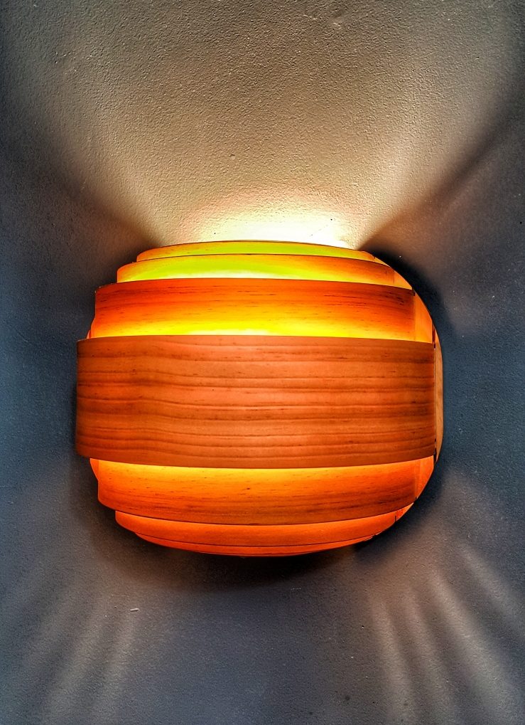 We bought these semi-circular sconces at the going-out-of-business sale for a local design store, and they've been a simple joy. They are all wood but almost translucent,