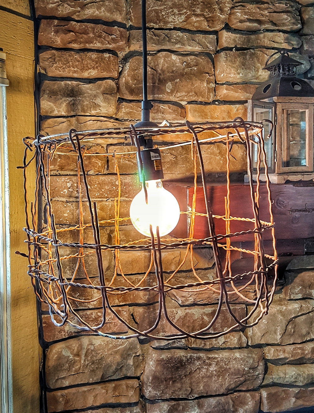 Pro Tip: LED bulb prices have come way down. Replace your 50 watt track light bulbs with even brighter LED bulbs that only use 6 watts. My whole 5-light kitchen track system now only uses 30 watts, less than a single halogen! And its much brighter (and yes, dim-able). (Note: Switching out florescents for LEDs is a bit more tricky and might require a new fixture.)We have more than our share of hanging lamps in the house, several given to us like this shabby chic lamp with a wire lampshade. Not my favorite, but there is something charming about it. And the wife loves it.