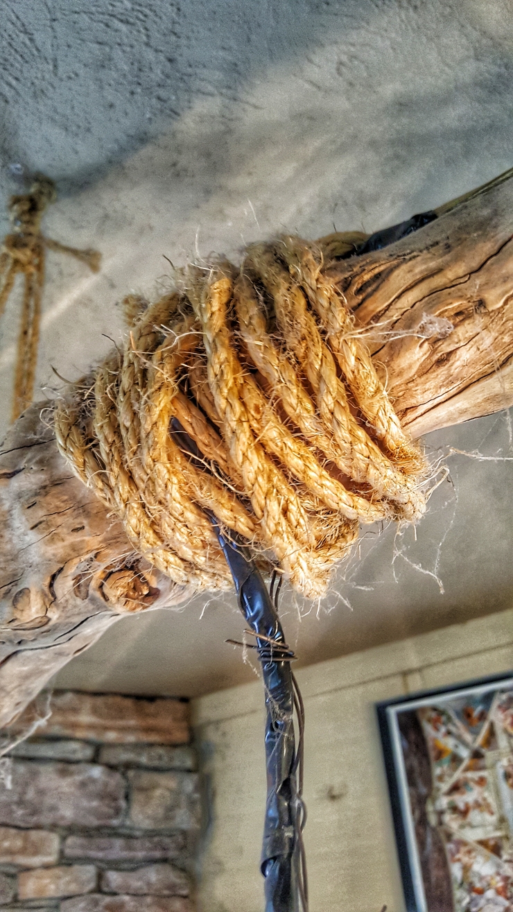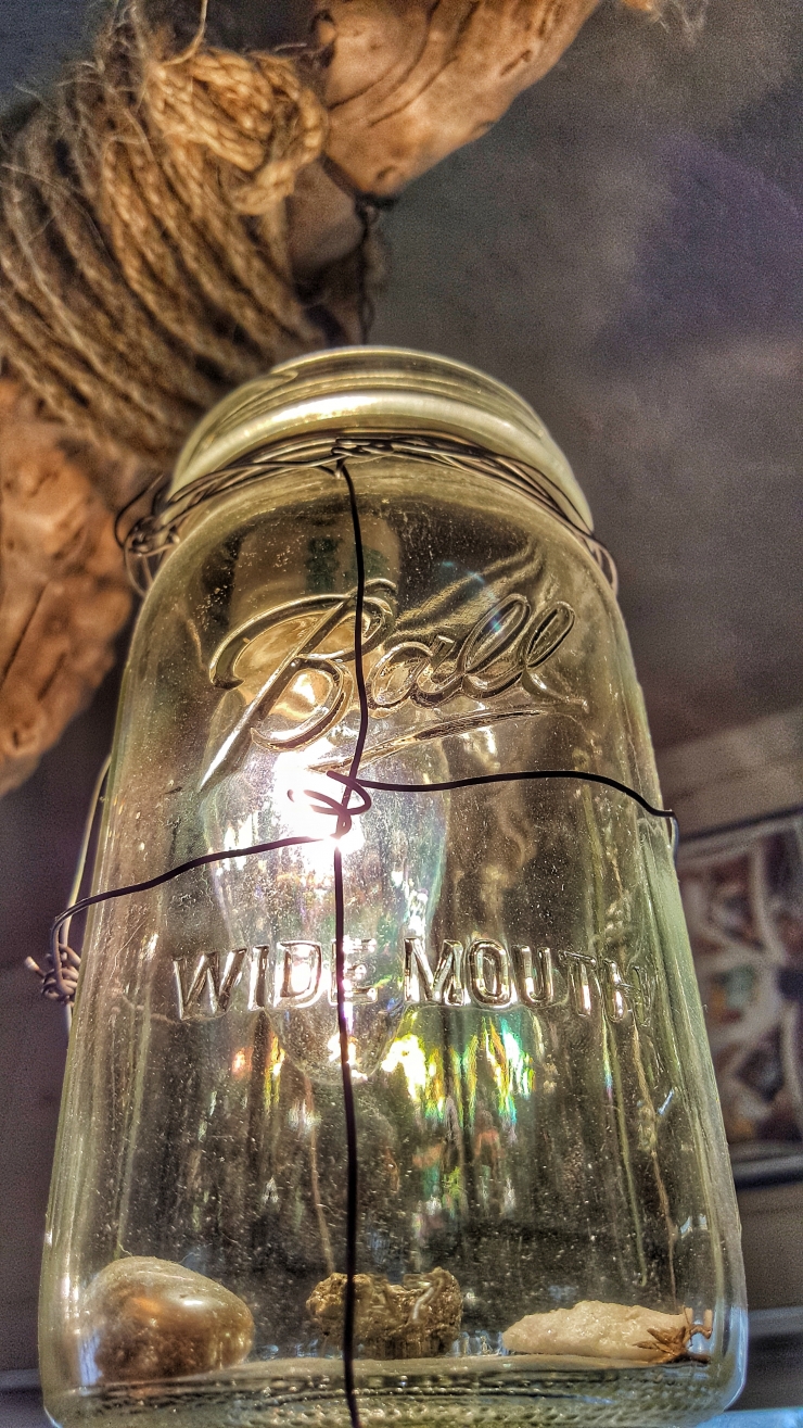 driftwood I picked up at Falls of The Ohio state park on the Ohio River (my favorite spot for driftwood), some Ball jars from Goodwill, jute rope from Lowe's, electrical tape and wire. I'll happily to make you one, if you like.