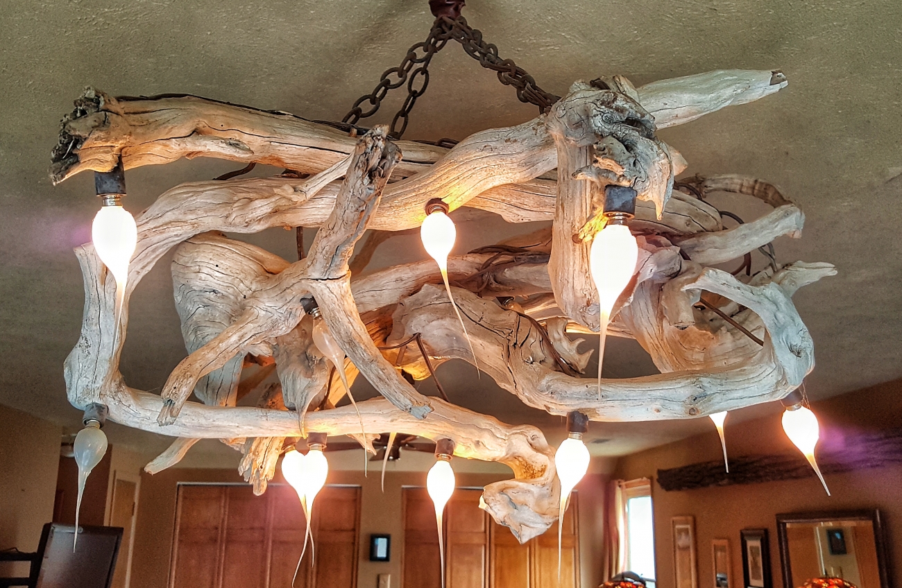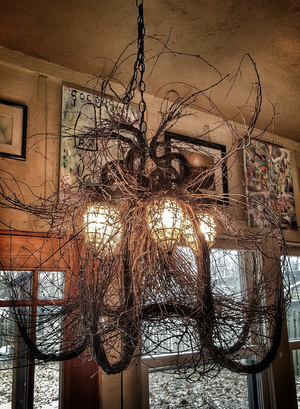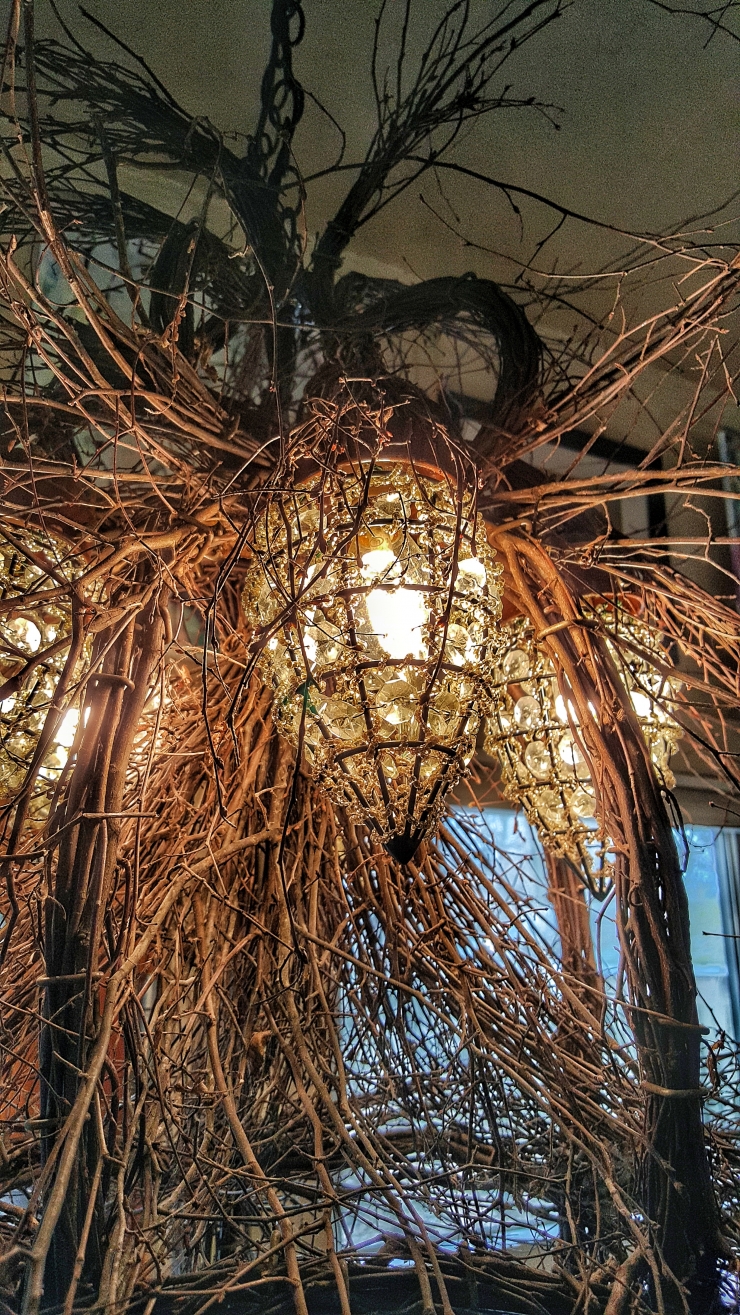 Seemingly straight outta some enchanted forest, this one is made of twigs on a chandelier frame, with crystal jewel and metal frame light covers. It was a gift from her sister who bought it, then couldn't figure out where to put it. (Don't worry, the cool LED bulbs won't catch this on fire.)