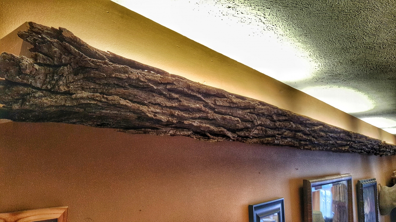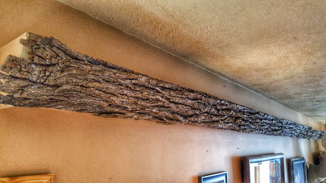 I thought it was a pretty ingenious way to light the space, until one of my friends commented, "That's a gutter!" And I realized it was, which put my appreciation of it in the...you know. My mission became to make it less gutter-like and I asked God to give me an idea. On spiritual retreat one day, I came across a dead tree in the woods that had sloughed off its bark. Dramatic, deep-grooved tulip tree bark. It was laying on the ground in one perfect 20' piece.