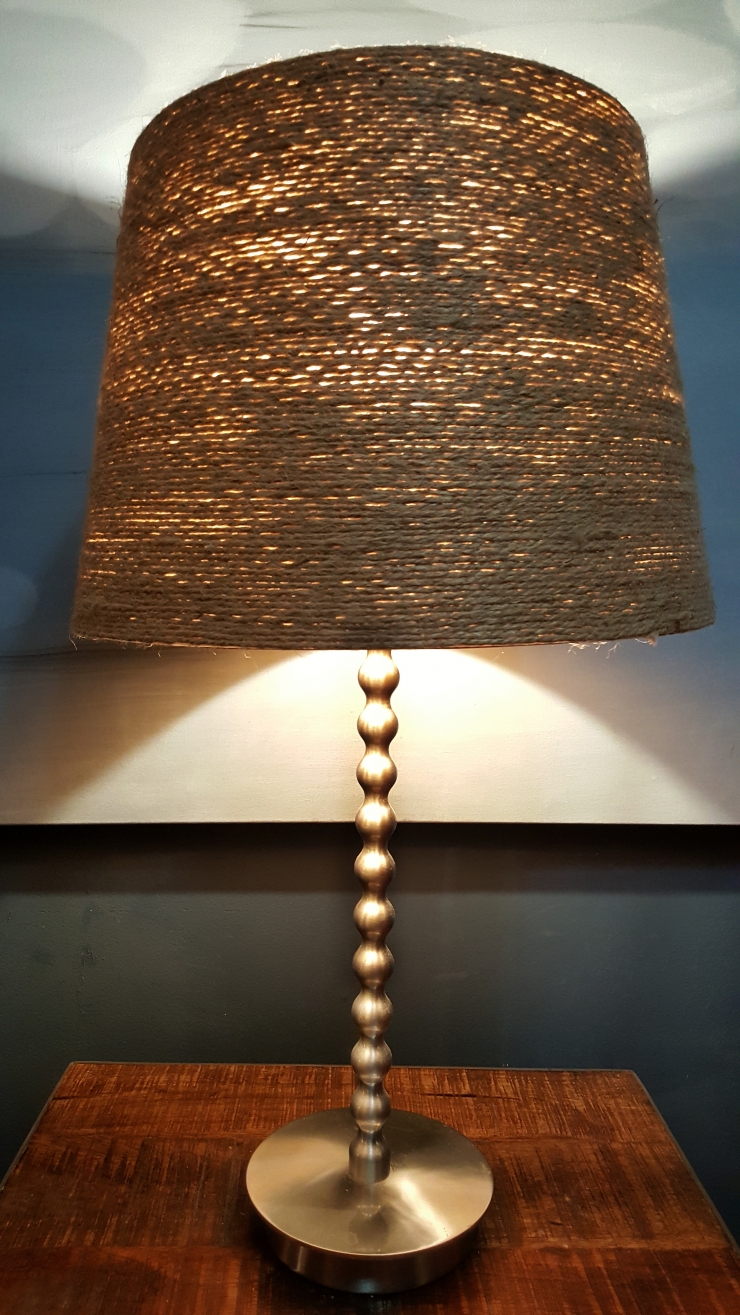 We decided to juxtapose the modern, sleek stand with a natural jute shade from World Market. I think it works.